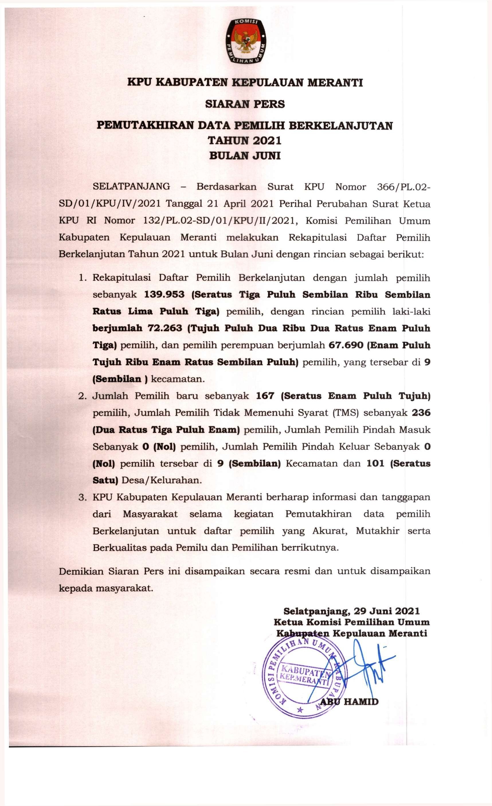 Selasa 29 Juni 2021, KPU Kabupaten Kepulauan Meranti melaksanakan Rapat Pleno terkait Rekapitulasi Daftar Pemilih Berkelanjutan.