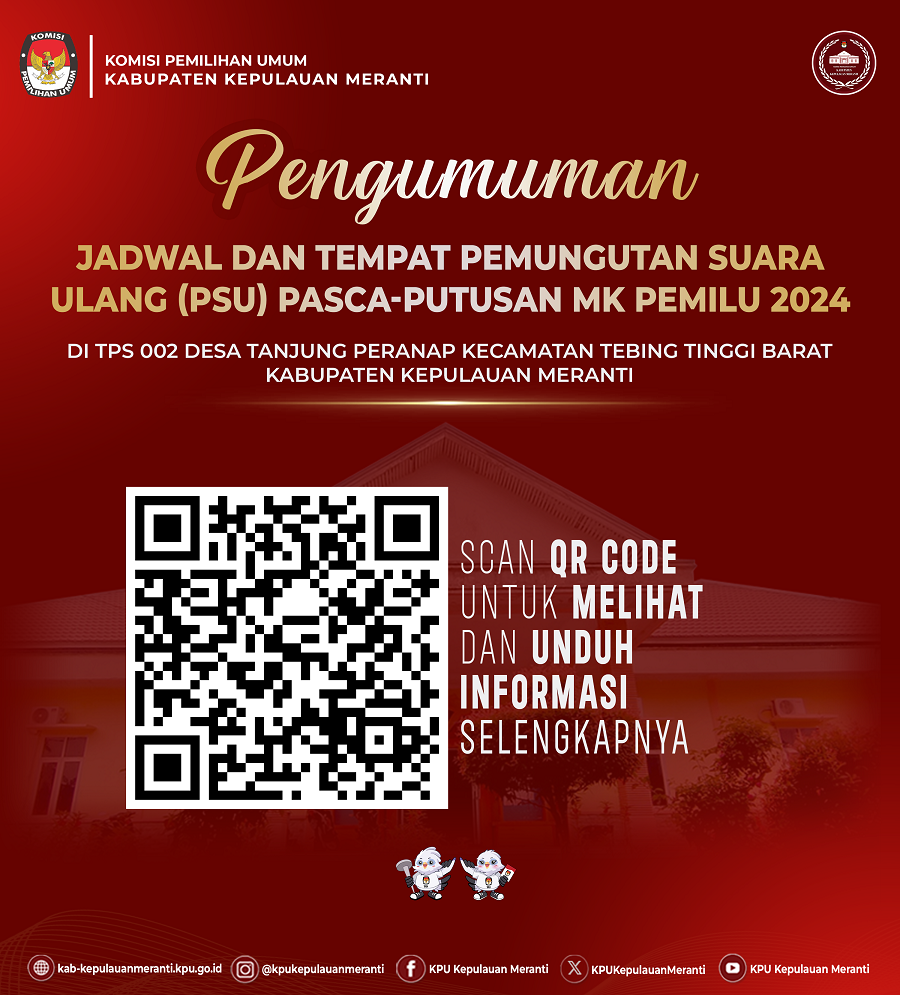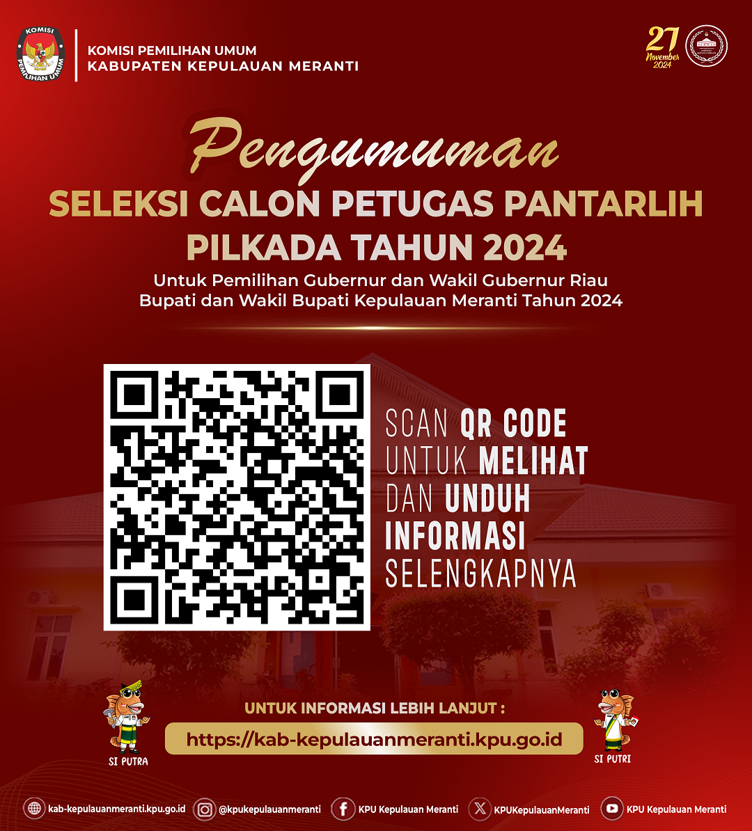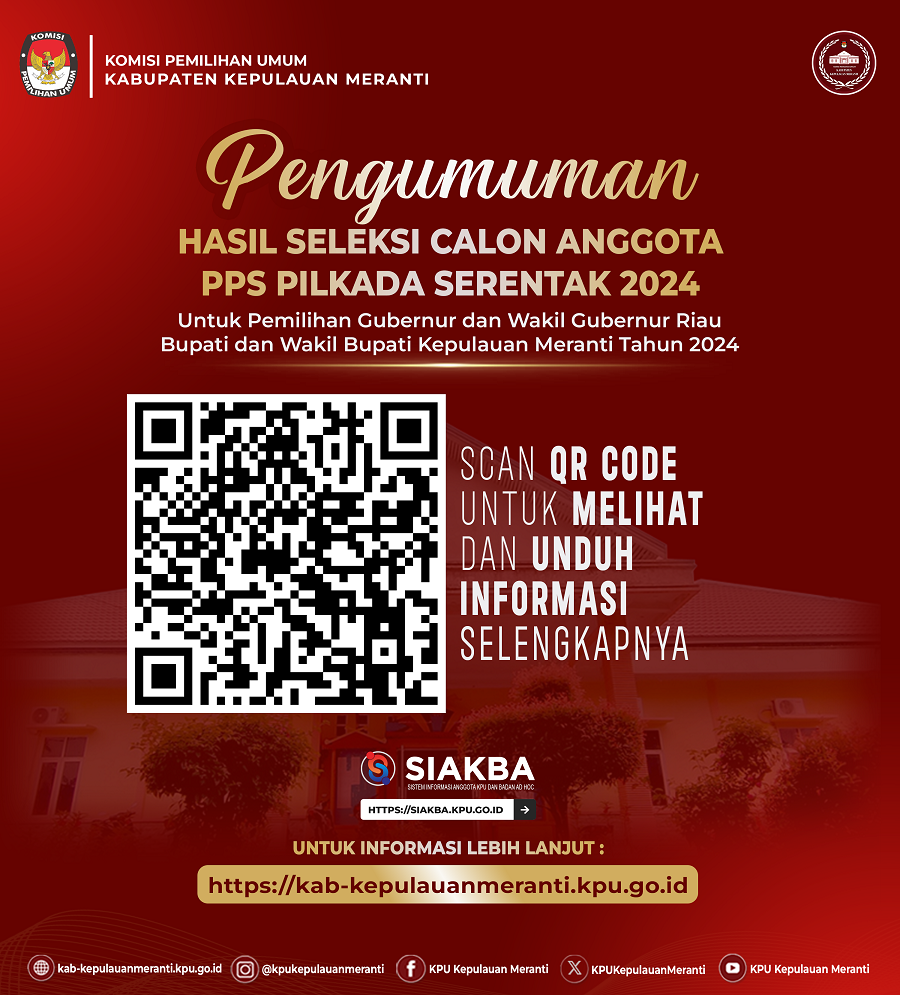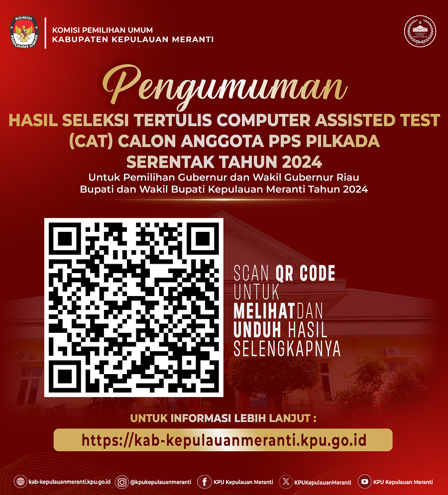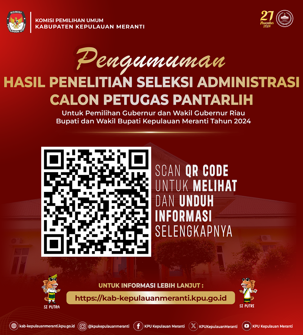 PENGUMUMAN NOMOR : 173 /SDM.02.1-PU/1410/2024 TENTANG HASIL PENELITIAN SELEKSI ADMINISTRASI CALON PETUGAS PEMUTAKHIRAN DATA PEMILIH UNTUK PEMILIHAN GUBERNUR DAN WAKIL GUBERNUR, BUPATI DAN WAKIL BUPATI PADA KABUPATEN KEPULAUAN MERANTI TAHUN 2024